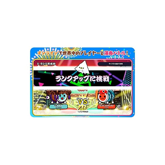 相棒のどんちゃん、オミコシティで出会ったくもきゅんと一緒に太鼓マスターを目指そう! 収録曲は「紅蓮華」「Feel Special」「夜に駆ける」など前作を超える76曲を収録! 苦手な部分を繰り返し練習してスキルアップできる「上達サポート」や、世界中のプレイヤーと演奏バトルを楽しめる「オンラインランクマッチ」! 他にも、おもちゃでデッキを組んで戦う「ドンカツおもちゃ大戦」、4人でライブの成功を目指す「どんちゃんバンド」などみんなで遊べる新モードも搭載!