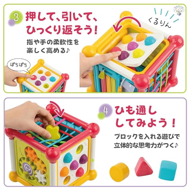 【何時間も楽しめる!わくわく6キューブ】楽器・歯車・ひも通し・ブロック・飛び出す仕掛け、引っ張り遊びなど、楽しいしかけがいっぱいの「わくわく6キューブ」。赤ちゃんの好奇心を次々に刺激して、長い時間遊ぶことができます。
