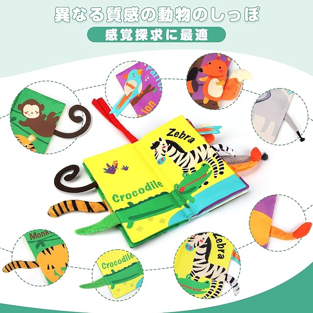 beiens 布絵本 布のおもちゃ 赤ちゃん 洗える【ピーピーの音が出てくる】 【動物シリーズ・3Dアクティビティブック】 おでかけ布えほん 幼児 0歳から 指遊び 歯がため ベビーカー用おもちゃ 知育玩具 幼稚園 出産祝い 子供 (Jungle Tails)