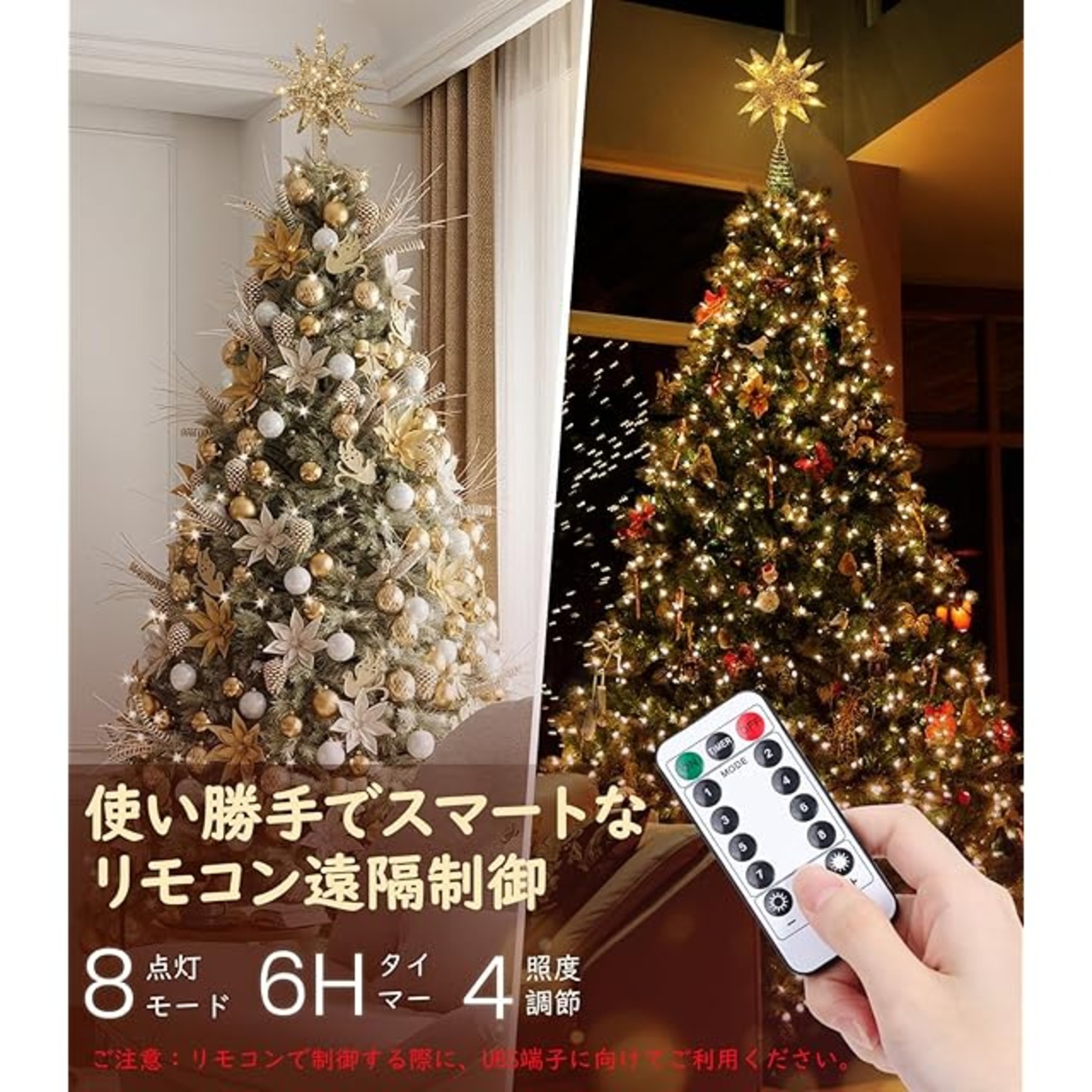 「ツリーを幻想的に演出」星中身には複数のLEDライトが施されており、USB給電ケーブル接続で稼働させる扱いやすい簡単な仕組みより、スイッチを入れるだけで、すぐに上品な輝きを放ち、ツリートップを鮮やかにライトアップできて、更に8種類の点灯モードより、雰囲気に合わせて点滅や点灯スピードなどを調節可能で、クリスマスツリーを幻想的に演出させて、より楽しむことができます。