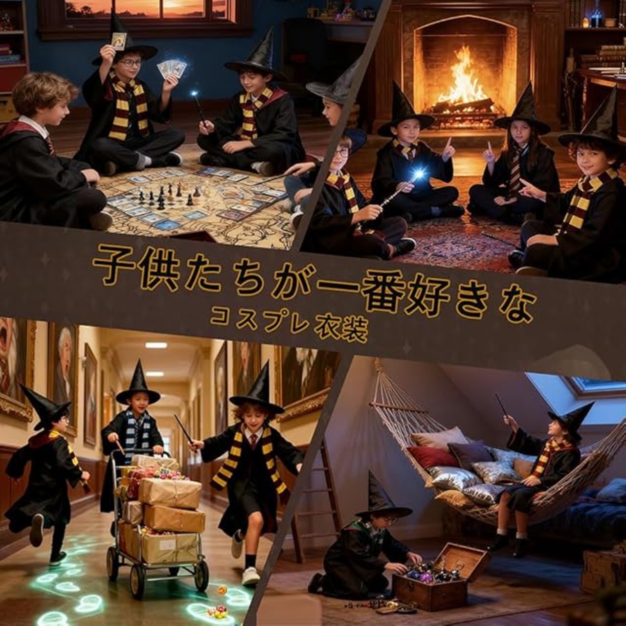 お子様向けのハリーポッターコスプレ衣装セットです。魔法ローブ、ネクタイ、マフラー、魔法帽、魔法の杖が含まれており、学園祭やハロウィン、パーティーなどのイベントで本格的な魔法使いの姿を楽しめます。男女兼用で、115〜155cmまで対応。誕生日やクリスマスなどのギフトにも最適です