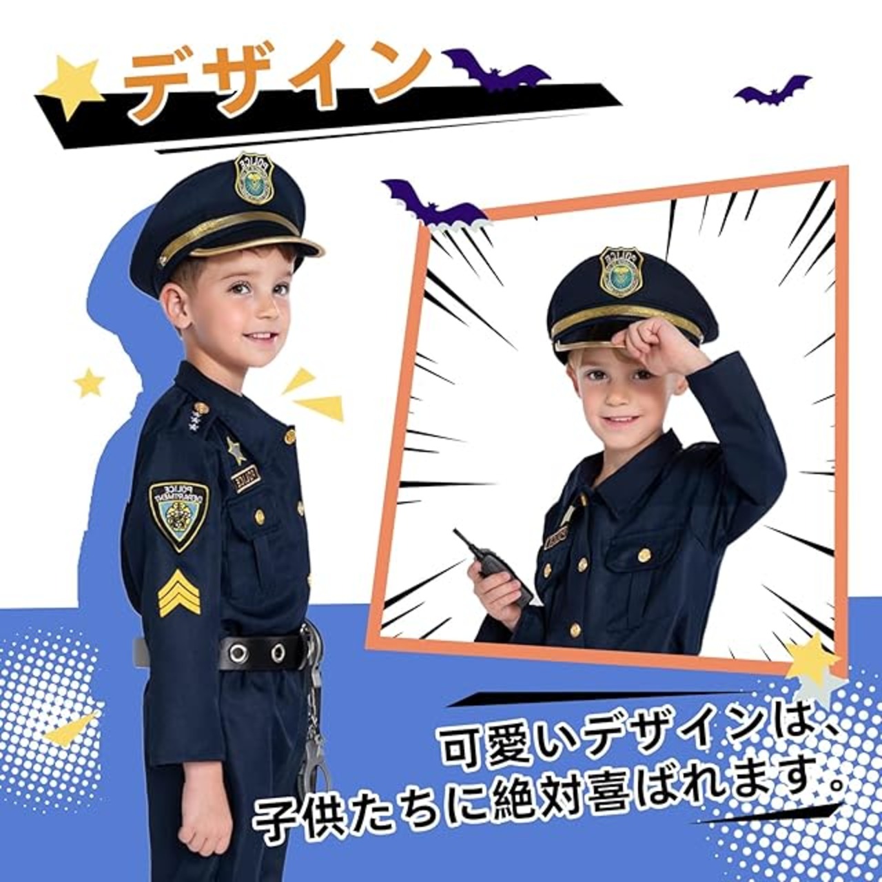 【多様な使用場面】ポリス コスプレ 子供 ハロウィンのイベントや、学園祭、演劇、誕生日など、さまざまな場面でご利用いただけます。普段着はもちろんのこと、ハロウィン コスプレ キッズ、イベント、パーティー、クリスマスなどでフル活用いただけるセットアップ商品です。ギフト・プレゼントにも喜ばれます。男の子も女の子も着て頂けます!