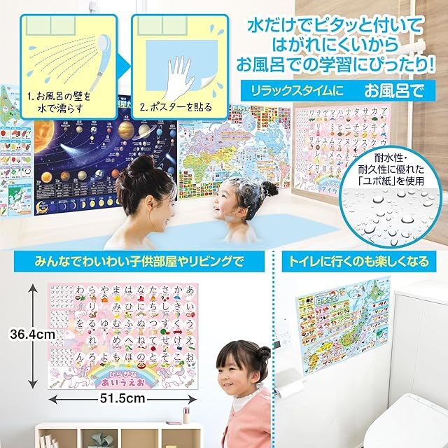 商品名:お風呂の学校 セット価格 地図/ひらがなとカタカナ(ユニコーン)お風呂ポスター2種類セット 日本製 地理 学習 知育 社会 お受験 B3サイズ 防水