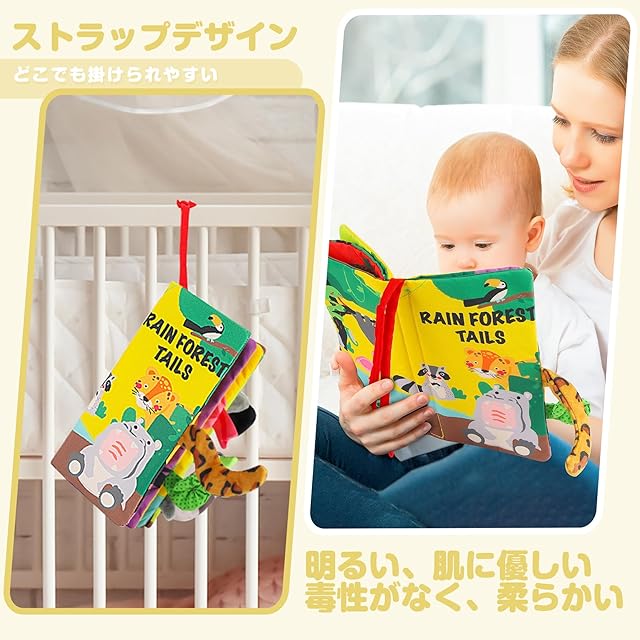 【!物事を知るための始まり!】赤ちゃんと一緒にこれらの動物のしっぽのテーマの布絵本を読んで、自然や動物に近づけることができます。子供用布の本は、言語能力、読書能力、感覚能力、コミュニケーション能力、そして豊かな想像力を刺激して、子供がスタートラインで勝つことができる、初期の知育玩具でもあります。【!お出かけ用には「ストラップ付き」や「洗濯しやすい」アイテム!】お出かけする際にお気に入りの布絵本を持っておくと、子どもがぐずってしまったときも助かります。ストラップ付き、ベビーカーやチャイルドシート・ママのバッグに付けられるので、落とす心配もありません。また、洗濯可能でいつでも清潔に使えるため、口に入れたり舐めたりしてしまう赤ちゃんも安心して使えるでしょう。赤ちゃんを連れてお出かけをする機会の多い方は、ストラップ付きや選択しやすくて大変便利です。