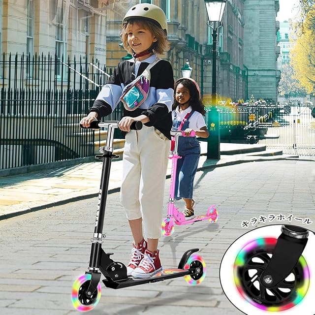 【LED点滅ホイール&滑り止めデッキ】:2輪共に電池不要の光るLEDホイール搭載。子供がキックスクーターに乗ると、ホイールを回すだけでカラフルに点灯します。見た目のかっこよさでお子様が喜ばれるだけでなく、夕暮れ、夜も目立つので、交通安全の役割もします。デッキ表面がざらざらに加工して、乗せた足が滑りにくい。