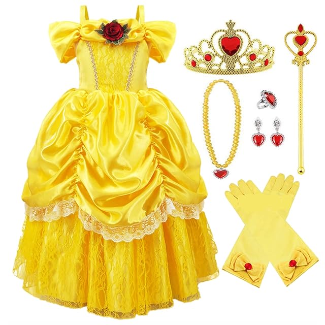 [TYHTYM] プリンセスドレス 子供用 ドレス キッズ (ドレス+ティアラなど) 豪華7点セット 100-140cm キッズコスチューム コスプレ イエローワンピース イベント ステージ衣装 変装 演出 仮装 クリスマス ハロウィン 誕生日 プレゼント (10-11Y)