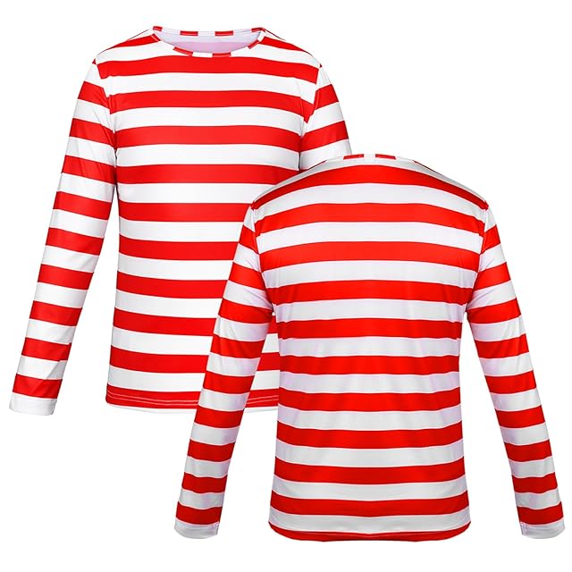 【セット内容】ウォーリーを探せの定番衣装です、男性用と子供用は3点セットです(赤と白のボーダーTシャツ、ポンポン帽、レンズなしメガネ)、女性用は4点セットです(赤と白のボーダーTシャツ、ポンポン帽、レンズなしメガネ、ニーハイソックス)。