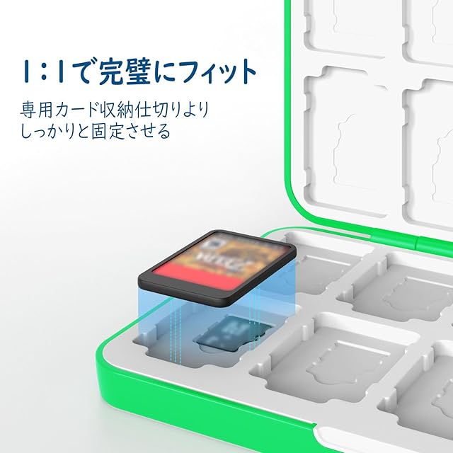 「大容量カード収納」 収納スペースを最大化した合理的に設計し、カードの形に仕切りした収納スロットで、各カードをピッタリ装着して固定収納できます。最大24枚Switchソフトを収納できる他、Micro SDカードも24枚同時に収納保管できます。