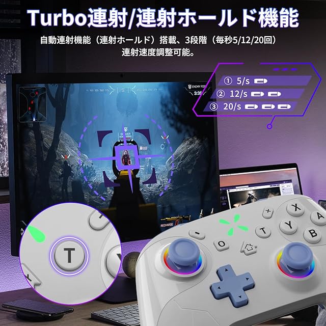 【6軸ジャイロセンサー搭載&自動連射(連射ホールド)機能】純正プロコンと同等の高感度6軸ジャイロセンサーを搭載し、コントローラーの傾きや動きを検知できます。(一部のゲームでジャイロセンサーが反応しない場合は、ゲーム内でまたは本体設定で補正することを試してください。)視点移動や傾け操作などが簡単に実現し、今までと異なるゲーム体験が楽しめます。スクリーンショット機能付き、Turboボタンをワンタッチでゲームの画像を簡単に保存しております。また、本コントローラーは自動連射機能付き、TURBOボタンと設定したいボタン(A/B/X/Y/L/ZL/R/ZRボタン)を同時に押して、手動連射になって、再度押すと、自動連射(連射ホールド)になって、三度目押すと、連射が解除されます。Turbo連射速度は3段階(毎秒5/12/20回)の微調整ができ、ゲームや自分のプレイスタイルに合わせて設置できます。
