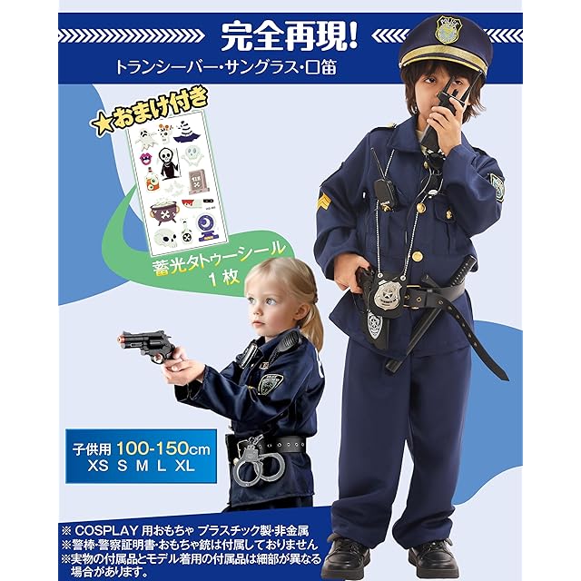 ■【本格9点フルセット 警察官コスプレ】<br/> ❶上着 ❷ズボン ❸帽子 ❹ベルト ❺サングラス ❻ホルスター (COSPLAY用おもちゃ) ❼プラスチック手金定 (COSPLAY用おもちゃ 非金属) ❽警笛<br/> ❾トランシーバー。おまけ付き:蓄光タトゥーシール1枚付き(水で肌に貼り付けるタイプ)<br/> ■【警察官に変身!可愛く変装してHalloweenを楽しもう!!】<br/> 海外の警察官をイメージしデザイン、質感までこだわったコスチュームです。カッコイイポリスごっこが楽しめます。<br/> ■【サイズは100cm~150cmまで5段階(XS~XL)のフィット感】<br/> 幼児から小学生まで、さまざまな年齢の子供たちが使用できます。お子様の身長にピッタリ合ったジャストサイズを選べます。<br/> ■【特別な日のプレゼントにもぴったり】<br/> ハロウィンだけでなく、イベントやご自宅でのお遊びにもぴったりです。この警察官コスプレセットは、子供たちがハロウィンやクリスマス、幼稚園のイベントで大活躍すること間違いなし!<br/> ■【イベントや記念撮影に】<br/> ハロウィンやイベントで注目を集めること間違いなしの警察官コスプレ衣装は、子供たちが夢中になる完璧な9点セットです。ハロウィンやお誕生パーティーにピッタリ!記念撮影やなりきりごっこにもおすすめです。