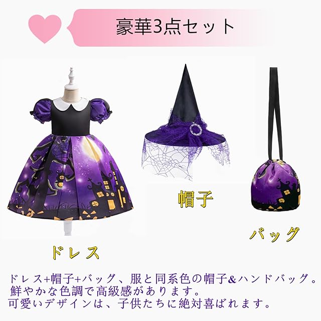 [SUBTRY] ハロウィン コスプレ 仮装 子供ドレス 魔女 仮装 コスプレ 3 点セット『ドレス+帽子+バッグ』カボチャ 悪魔 子供 可愛い 演出服 女の子(セット01.パープル,150cm)