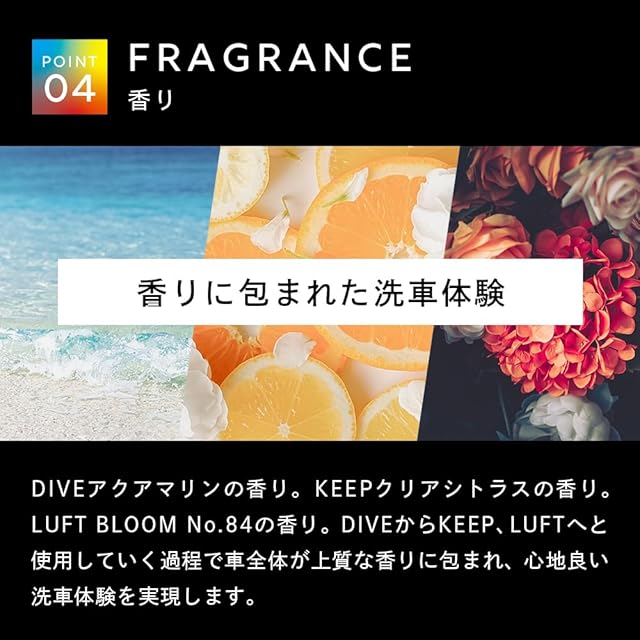 PHとは水素イオン指数のこと。 中性帯を6〜8として、それより小さい場合は酸性、大きいとアルカリ性となります。 3pH洗車とは3種類の異なる液性のシャンプーを順番に使用することで、 様々な汚れを効果的に落とす洗車方法です。 有機汚れに効果的なDIVE。無機汚れに効果的なKEEP。 良質な潤滑層を形成しコンタクトウォッシュに最適なLUFT。 それぞれのシャンプーの香りが洗車をエンターテイメントへ昇華させ愛車の輝きを取り戻します。