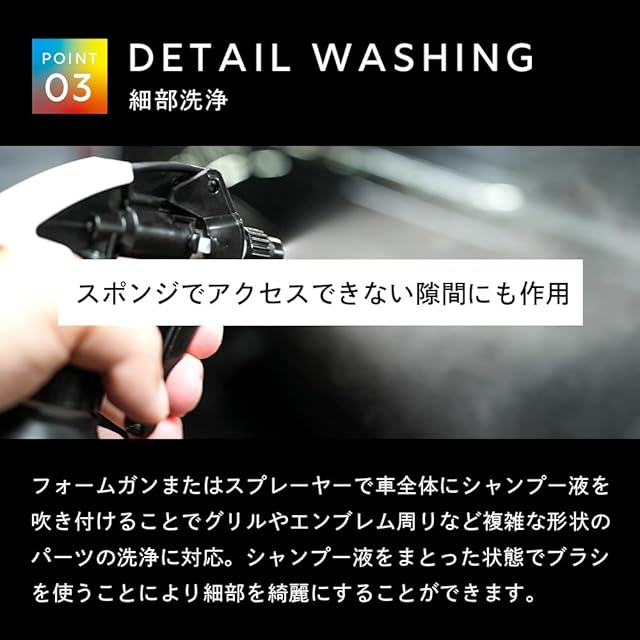 フォームガンまたはスプレーヤーで車全体にシャンプー液を吹き付けることでグリルやエンブレム周りなど複雑な形状のパーツの洗浄に対応。 シャンプー液をまとった状態でブラシを使うことにより細部を綺麗にすることができます。