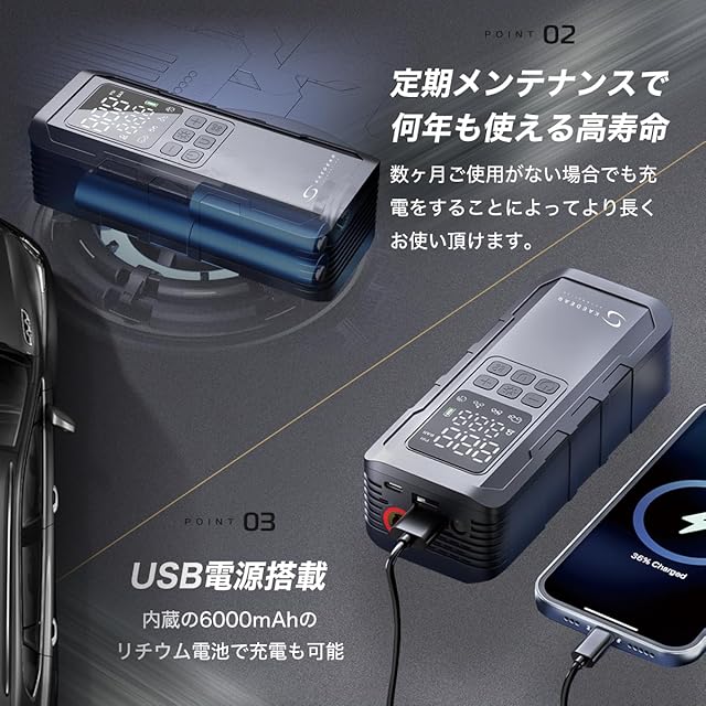 【今までできなかったことがこれ一台で完結】 ・適正空気圧を保つことでタイヤの変摩耗防止や燃費の向上。・USB電源(5V 2A / 9V 1.5A)搭載で電子機器の充電も可能。・ボールや浮き輪の空気入れ等レジャーでも活躍。・パンク修理後の空気の充填。・ロードコンディションに合わせた空気圧調整。・LEDライトで暗い場所や夜間にも活躍。