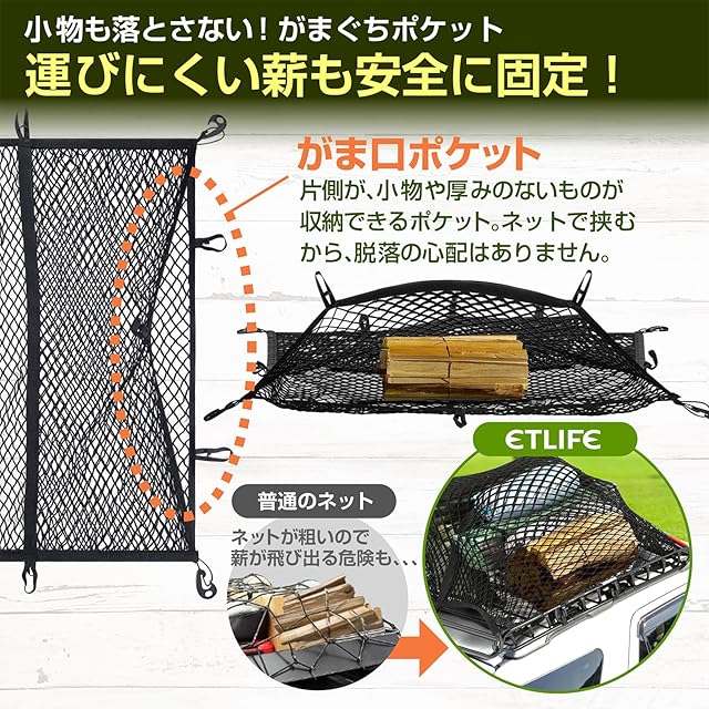 商品名:ETLIFE カーゴネット 車 90×120cm 2重【キャンプインストラクター監修 簡単設置で時短!絡まない!】ABS製フック×12 ステンレス製カラビナ×12 収納ポーチ付属 ルーフラック ネット ルーフネット ラゲッジネット ルーフキャリア 荷崩れ防止