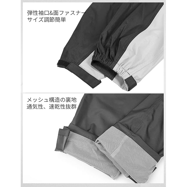 【究極の防水性】 防水性:IPX6級、耐水圧:10000mmH2O(一般的なナイロン傘の40倍)。猛烈な雨に(1時間雨量80mm以上)安全に走行できます。長時間の大雨などにさらされても水が染み込まないメンズ レインコートです。耐摩耗性PVC複合材質と多重密封設計により、最高の防水性と快適さを確保いたします。また、 レインウェアの細部に防水ファスナーと調節可能な袖口を備え、防水性能を向上させています。