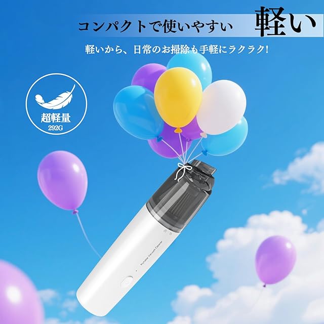 車用に最適な13000Pa超強力吸引 50000回転/分高出力モーターが砂粒・ペットの毛・食べかすを瞬時に吸引。「ハンディ掃除機」 トップクラスの吸引力で、シート隙間やフロアマットの頑固なゴミも一掃! 直通型デュアル風路でエネルギー効率30%向上。 292gの超軽量ボディで車内掃除が楽々 本体重量は「ペットボトル1本分未満」(約300g)。狭い車内でも片手でストレスフリー操作。「ハンディ クリーナー」 史上最軽量クラスの設計で、女性や高齢者も長時間使用可能。 分離式ダストカップ&水洗い可能HEPAフィルター 200mL大容量カップが埃をロック。「コードレスハンディクリーナー」 で唯一のワンタッチ分離構造で、塵に触れず衛生的に廃棄。微粒子99%捕捉フィルターは水洗いで繰り返し使えます。 吸引/ブロワー2WAYで多用途活用 付属ノズルで「吹き飛ばす&吸い込む」 を自由に切替。吸引モードは車内清掃に、ブロワーモードはパソコン冷却・キャンプ用エアマットレス充填に。家庭からアウトドアまで「ポータブル掃除機」 として活躍! Type-C急速充電&コンパクト収納 満充電で最大30分連続稼働。スマホと共用のType-C充電で災害時も安心。コードレス設計でトランク収納に便利。車のシガーソケット充電にも対応!