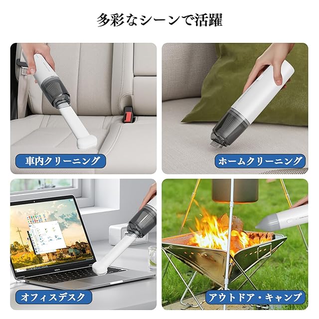 吸引/ブロワー2WAYで多用途活用 付属ノズルで「吹き飛ばす&吸い込む」 を自由に切替。吸引モードは車内清掃に、ブロワーモードはパソコン冷却・キャンプ用エアマットレス充填に。家庭からアウトドアまで「ポータブル掃除機」 として活躍!