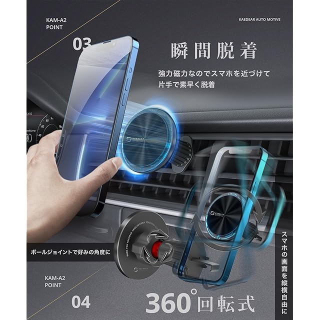 商品名:KaedearAutoMotive(カエディア) 車 スマホホルダー ワイヤレス充電 magsafe 高速 充電 マグネット 車載ホルダー エアコンフック 車載スマホホルダー Blue LED KAM-A2