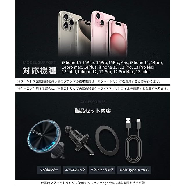 【商品詳細】 ■対応機種:非接触充電対応機種 入力5V3A/9V3A/12V2A 出力 5W/7.5W/10W/15W ■サイズ:71mmx71mm 厚さ30.5mm ■材質:アルミニウム ■セット内容:マグホルダー本体、USBケーブル【C】、エアコンフックマウント、■取扱説明書(オンラインのみ):環境負荷の軽減を目指した脱炭素化への取り組みとして、紙媒体での同封を控えさせていただいております。Kaedear公式サイトの各商品ページから閲覧またはダウンロードが可能です。