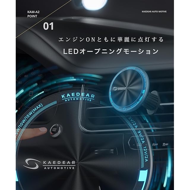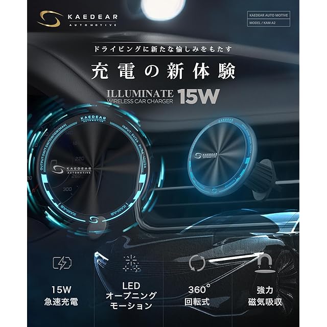 【車内をオシャレに LED&充電機能搭載】 バイク用スマホホルダーで人気のカエディアが手掛ける車載用スマートフォンホルダー。従来のカー用品の携帯ホルダーだと脱着に時間がかかる、充電が安定しない等のデメリットがございます。今回新登場のKAM-A2はそんなお客様のニーズにお応えした商品です。経験と実績のあるkaedearならではの製品となっております。 【スマホホルダーの機能は当たり前、車内のアクセントに】 カー用品のスマホホルダーで多く見られる車内の揺れによる落下。予期せぬ振動による携帯電話の落下で運転中に慌てた経験はありませんか。強力なマグネットの磁力でスマホをしっかりとキャッチし、安定した給電を実現しました。LEDを搭載しており、車内のラグジュアリー感も演出します。 【取り付けも簡単!】 従来の携帯スタンドは固定がしっかり固定されるほど取り外しが思い通りにいかない事例や固定に取り付けが大変な物も多くありました。本製品は取り付けも簡単ですぐに導入ができスマホを脱着する回数が多い方におススメです。 【商品詳細】 ■対応機種:非接触充電対応機種 入力5V3A/9V3A/12V2A 出力 5W/7.5W/10W/15W ■サイズ:71mmx71mm 厚さ30.5mm ■材質:アルミニウム ■セット内容:マグホルダー本体、USBケーブル【C】、エアコンフックマウント、■取扱説明書(オンラインのみ):環境負荷の軽減を目指した脱炭素化への取り組みとして、紙媒体での同封を控えさせていただいております。Kaedear公式サイトの各商品ページから閲覧またはダウンロードが可能です。【メーカーとアフターサービスについて】 ■" ■メーカー期間:1年(ご購入日と同日が期限) カエディアではお客様にご満足頂ける様、販売後もサポートさせて頂きます。 商品のご不明な点はもちろん、バイクへのお取り付けに関するご相談は、国家整備資格を保有したスタッフがおりますので、専門知識に対しても的確に対応させて頂きます。 万一、製品不良に起因する不具合と診断される場合は、弊社のメーカー規定に基づき審議させて頂き、メーカーによる無償での修理、交換を行わせて頂きます。業務用に使用される際は、メーカー期間を半分の期間とさせて頂きます(例:メーカー期間が1年の場合、6ヶ月となり、ご購入日の月に6ヶ月を加算した同日が期限)詳細は公式サイト内メーカー規定をご覧下さい。 お取り付け後、ご使用後でも、対応させて頂きます。日本メーカーとして、おもてなしの心で対応致します。先ずはお気軽にご相談下さい。"