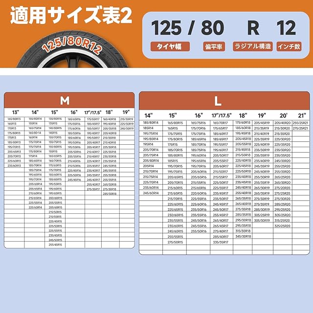 S適応タイヤ:155/60R15、155/65R15、165/50R15、165/55R15、165/60R15、175/50R15、175/55R15、175/60R15、185/50R15、185/55R15、195/45R15、195/50R15、205/40R15、205/45R15、205/50R15、215/45R15、165/45R16、165/50R16、175/50R16、185/50R16、195/40R16、195/45R16、205/40R16、205/45R16、215/40R16、225/40R16、255/35R16、165/35R17、165/40R17、185/35R17、195/40R17、215/35R17、225/35R17、165/35R18、245/25R18、255/25R18、265/25R18、275/25R18