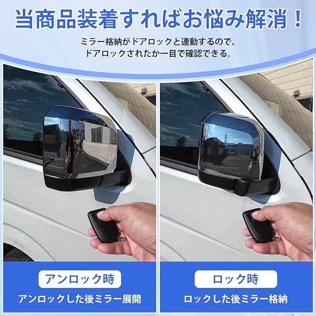 ドアミラー自動格納キット:ハイゼットトラックS500P/S510P キーレス連動自動格納ユニットを装着することで、車のキーロック・アンロック動作に連動してドアミラーが自動的に開閉します。これにより、ミラーの閉じ忘れを防ぐだけでなく、駐車時に手動でミラーを折り畳む必要がなくなります。また、ミラーの開閉状態で車両のロック状況を一目で確認できるため、安心して車を離れることができます。さらに、狭い駐車スペースでもミラーの傷つきを防ぐことができ、安全性と便利さを両立しています。※純正のドアミラー格納スイッチはこれまで通りお使いいただけます。