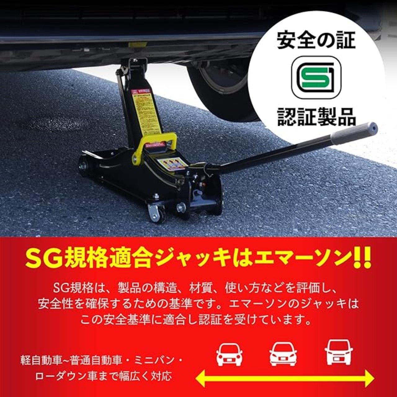 商品名:エマーソン(Emerson) ローダウンジャッキ 2t SG規格適合品 【最低位】80mm【最高位】380mm 軽自動車~普通自動車・ミニバン・ローダウン車 別売アダプターでサイド掛けも可能 EM-511