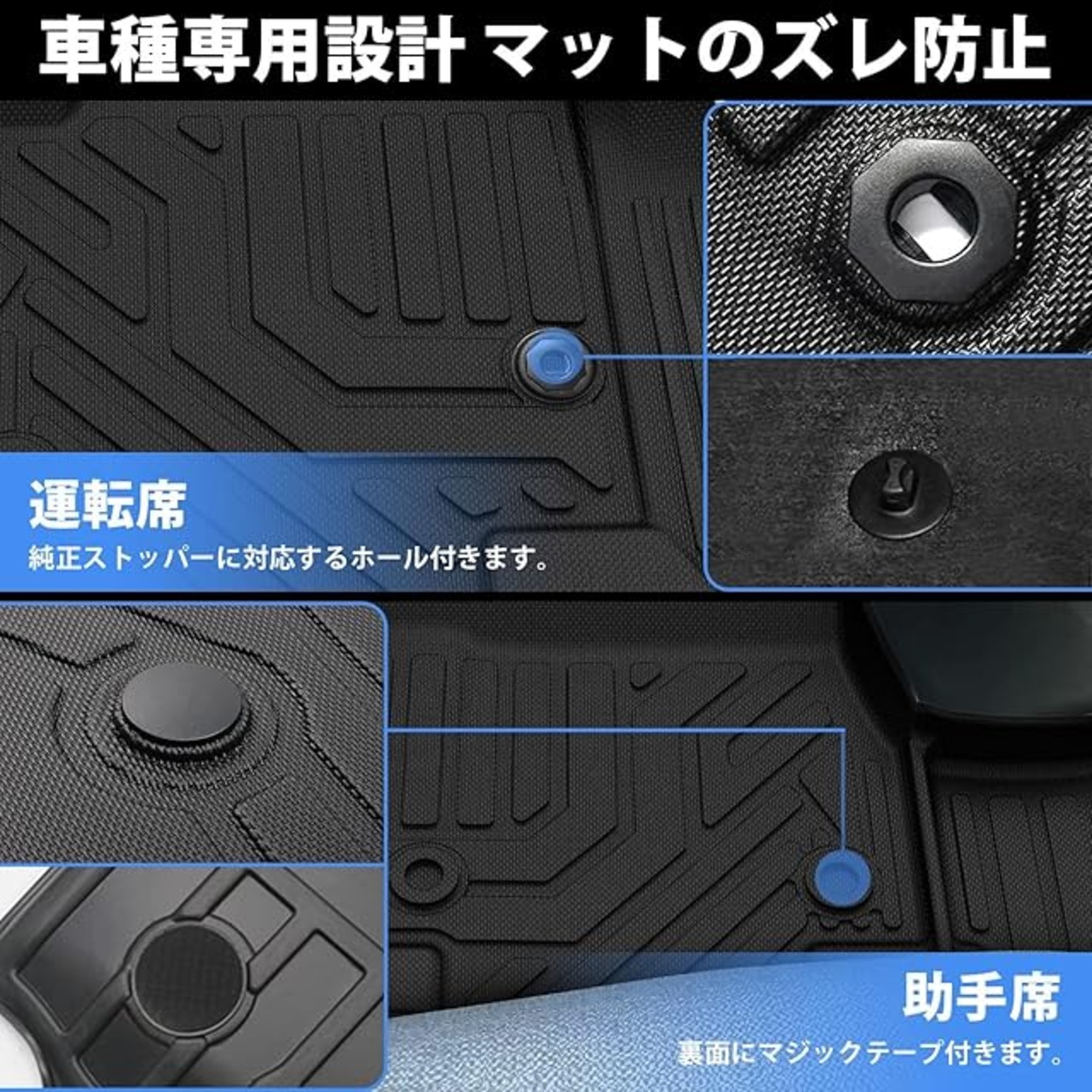 【車種専用設計でピッタリフィット】■車種専用設計、マットのズレ防止。運転席は純正ストッパーに対応するホール付きます。それに、助手席は留め具裏面にはマジックテープ付きます。■アクセルペダルとブレーキペダルに干渉しません。■座席のスライドレールに干渉しません。抜群フィッティングします。こだわり車種専用設計のため、車内に隙間なくフィットします。