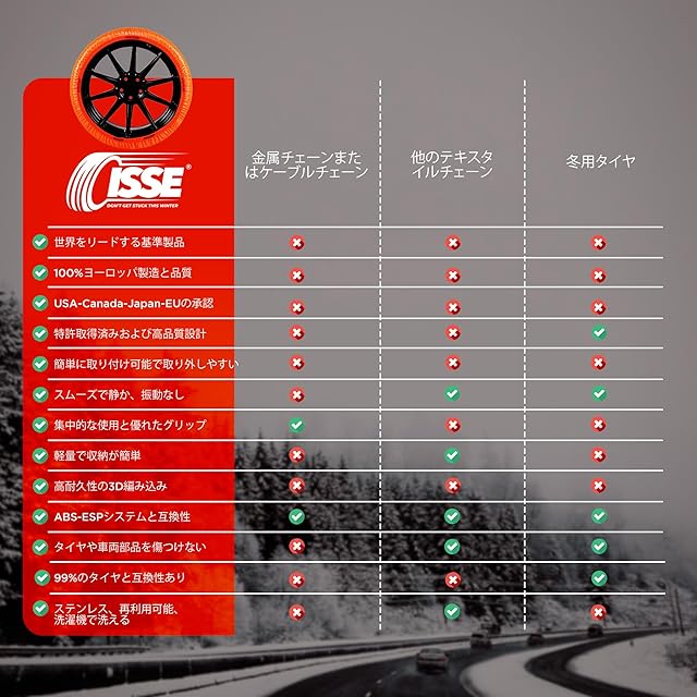 軽量で取り付けも簡単な布製タイヤチェーンはいざという時の緊急脱出ツールとして注目されています。<br><br> イッセ・スノーソックスは、軽量でコンパクト、取り付けやすいという布製ならではの特性はもとより、金属チェーンに匹敵する圧倒的なグリップ力をほこるヨーロッパ生まれの布製タイヤチェーンです。<br><br> 圧雪、深雪、アイスバーンの他、水分の多い日本の雪路、シャーベット状の路面、どんなコンディションでも安心して走行できます。<br><br> 生地は業界最強級の耐久性を誇り、繰り返し装着しても破れません。また独自のオートセンター機能がイッセ・スノーソックスを走行中も適正な位置に維持し、ずれません。<br><br> 6サイズで市販のほぼすべてのタイヤサイズをカバー。SUVや大型乗用車、クリアランスの狭いスポーツカータイプにも装着できます。年に数回の利用であれば洗って保管することで数年は使用可能なため、冬用タイヤに履き替えるための時間的・経済的なコストもありません。<br>