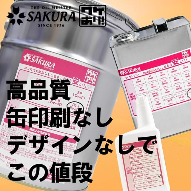 【ワケあり エンジンオイルの特徴】<br>無地缶(ペイントデザイン無し)にラベルを貼り、オイルを充填しています。ペイント無しの無地缶なのでお安く提供しています。<br><br>【品質規格】 API : SP <br>【粘 度】 SAE:10W-30<br>【ベースオイル】 化学合成油100%<br>【API規格:SP】<br> これまで一番厳しい規格であったSN規格よりも、省燃費性能、酸化安定性、触媒システム保護性能、スラッジコントロール、<br>ピストン及びエンジン清浄性、コロージョン防止性、チェーン摩耗性、LSPIが優れているエンジンオイルです。<br>省燃費性能はSN規格対比3.0%以上の改善。多くの性能面で「SP規格」が上回ります。<br>「SN規格」が出てから10年が経過しエンジンは大きく進歩しました。<br>この技術進歩に対応したオイルが新規格「SP規格」です。<br><br>【メーカー情報】<br>株式会社櫻製油所は1936年創業の<br>創業80年を超える大阪の老舗潤滑油専門メーカーです。<br>メーカーURL https://www.sakuraseiyusho.com/index.html