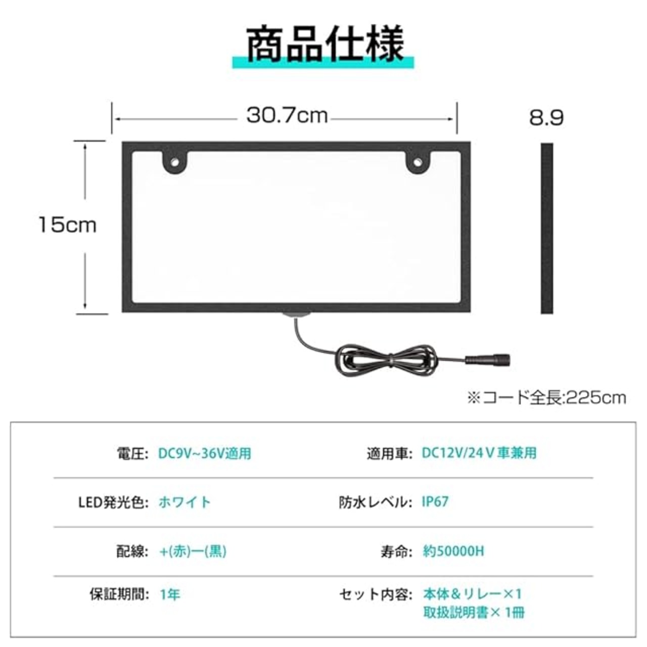【高輝度】:夜中に認識度を高めるため、上質な「LED 2835端子*15個」を採用され、最大可視距離30m達!明るく視認性抜群! 【スリムなデザイン】:厚さもクッション部分を含め約8mmと薄型で、裏面はクッション素材になっており、車を傷つけません。安全安心! 【実用性抜群】:従来の物は文字のみを照らすタイプのものでしたが 、LEDプレートはナンバープレート全体を照らすのでとっても明るく、ムラのない美しい仕上がり!愛車のナンバープレートを素敵にドレスアップ、字光式ナンバープレート1枚/セットです。 【耐久耐震】:上質なポリカーボネート生地を採用され、耐久性と耐震性は従来品より強くなります!防水、防塵レベルもIP65に達します。 【セット内容】:LEDナンバープレート*1枚セット、イグナーター *1個 ■メーカーについて ●期間は、お買い上げ日または封印がなされた日から一年間です! ●弊社が定める正常な動作条件、環境条件下でご使用のもと万ー故障が発生した場合、本書の規定に従い製品を無償修理または新品との交換が可能です。補修用性能部品には同等機能を有する代替品を含みます。但し修理または交換に伴う製品の取外し、装着および運搬などにかかる費用はの範囲外となりますのでご了承ください。 ●商品到着後は速やかに商品の状態をご確認ください。期間内に故障がございましたら、商品到着後1週間以内(初期不良)にご連絡頂ければ、送 料は当 店にて全額負担いたします。1週間後からは往復の送 料がお客様側にご負担になります。ご了承ください。 ●期間内に故障などに至り無償で修理または交換を受ける場合は、カスタマーサポートセンターへお問い合わせください。返 品する前に必ず連絡してください。(※着払いでされた場合、受け取り拒否となりますのでご注意ください。) ■対象外事項 (1)お客様の技術不足・知識不足により正常に取り付けされていない場合。 (2)取り付け車両・部品の老朽化や、故障等の原因で動作不良の場合。 (バッテリー消耗、配線の老朽化、電気系統の故障による電圧不足等) (3)火災、地震、落雷などの天災、騒乱などの人災、公害や異常電圧、異常温度、異常雰囲気などの不可抗力による故障または損傷。 (4)お買上げ後の落下、漏電などによる故障または損傷。 (5)本製品の故障および損傷に起因する付随的損害。 (6)お車を乗り換えた場合。