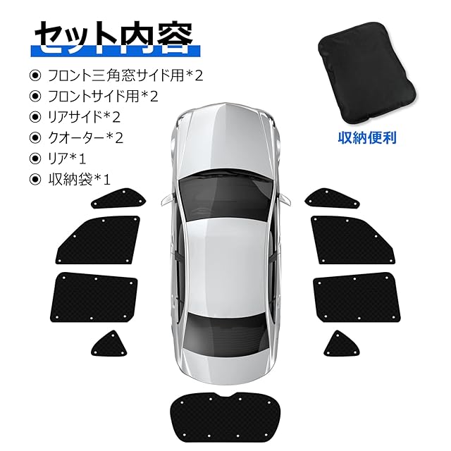 【安心の1年&商品スペック】セット内容:9枚セット(フロント三角窓サイド用*2、フロントサイド用*2、リアサイド*2、クオーター*2、リア*1、説明書*1、収納袋*1)※フロントサンシェードは別売りです。すべてのセットは含まれませんので、ご了承ください【メーカー製品】安心の1年付き、商品不良等における不具合は、ご遠慮なく「店名」-「質問する」の手順でクリックして連絡ください。無償で交換可能です。