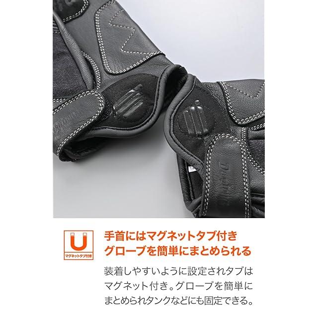 手首にはマグネット入りの引っぱりタブを採用。タンクなどに固定でき、左右のグローブをまとめて保管可能