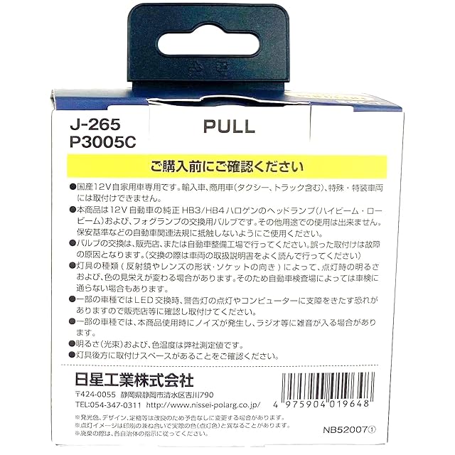 商品名:日星工業 POLARG(ポラーグ) ヘッドランプ/フォグランプ用 LEDバルブ 12V HB3/HB4 4200K 3000lm 2個入 ファンレス ハロゲンバルブ同等サイズ ポン付け J-265 P3005C 車検対応 信頼の純正バルブメーカー