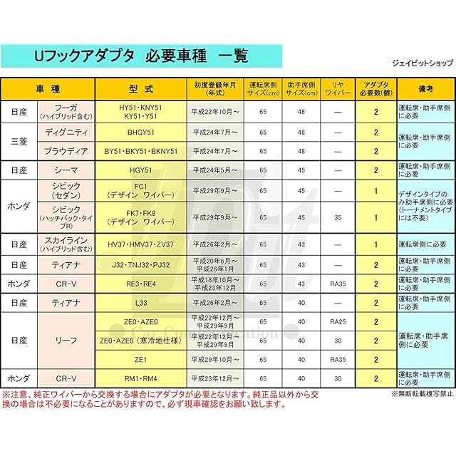 【注意1】適合に型式や初度登録年月等(車検証に記載)の適合条件をご確認の上、ご購入下さい。【注意2】本商品は、サイドUフックアダプタ2個がセットされています。純正ワイパーブレードから交換する場合、Uフックアダプタが必要です。