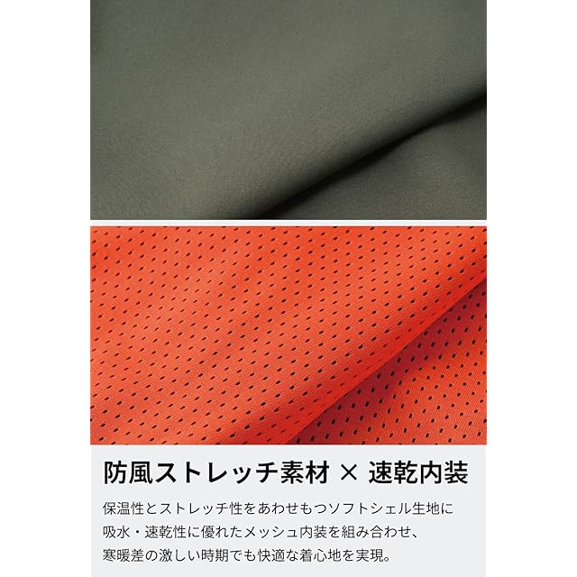 【防風ストレッチ素材×T-DRY速乾内装】保温性とストレッチ性をあわせもつソフトシェル生地に吸水・速乾性に優れたメッシュ内装を組み合わせ、寒暖差の激しい時期でも快適な着心地を実現。