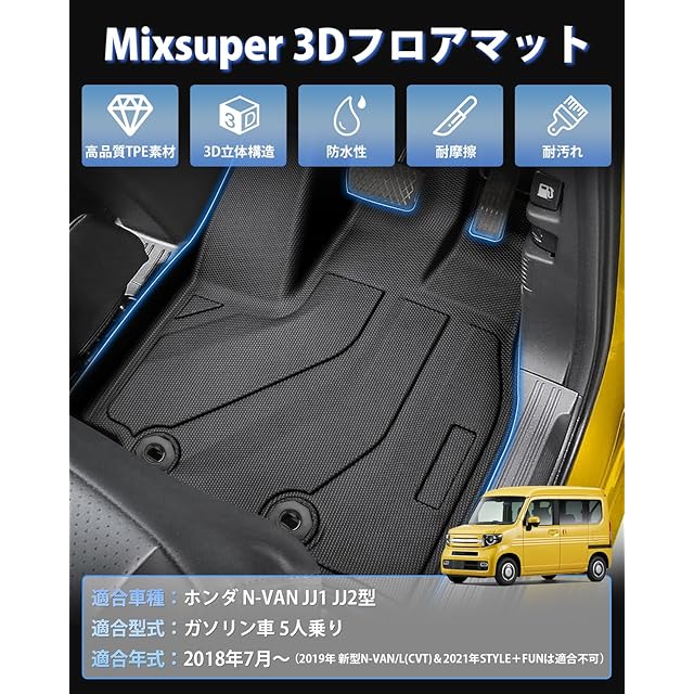 Mixsuper n-van JJ1 JJ2型 フロアマット 立体カーマット エヌバン 専用 3Dフロアマット セカンドマット 防水マット 5人乗り専用 2018年7月~ nvan カスタムパーツ TPE素材 車種専用設計 防水性 耐摩擦 耐汚れ 耐候性 難燃性
