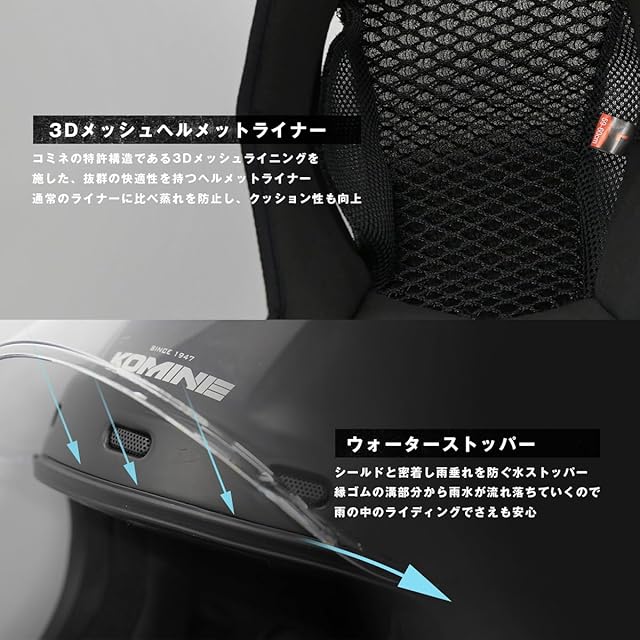 高品質ABSシェルを採用し、高強度を実現したレトロなデザインのフルフェイスヘルメット。 レトロな見た目ながらベンチレーション機能やコミネオリジナル構造の3Dメッシュライニングも採用。