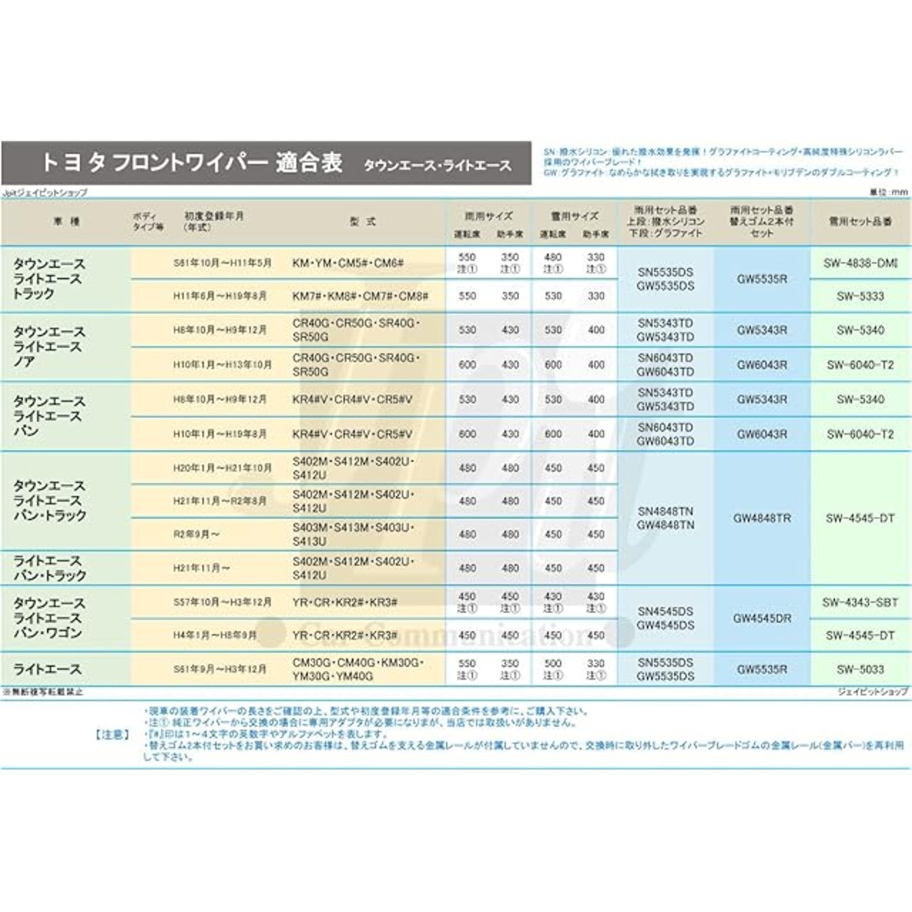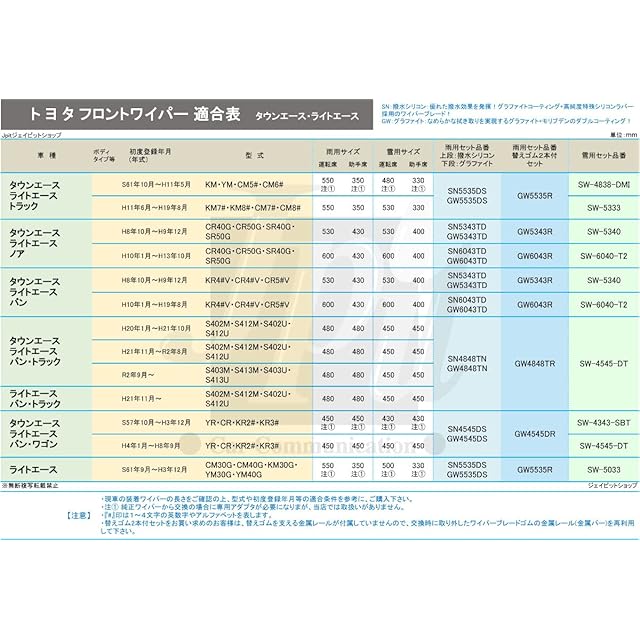 ダイハツ適合車種【シャレード 型式 G200S・G201S・G203S・G213S】【ミラ トコット 型式 LA550S・LA560S】【ムーヴ キャンバス 型式 LA800S・LA810S】【デルタワイド 型式 CB22G・CB31G・YB21G】トヨタ適合車種【センチュリー 型式 VG40・VG45 初度登録 平成4年8月~平成9年3月】【タウンエース/ライトエース バン・ワゴン 型式 YR#・CR#・KR2#・KR3# 初度登録 平成4年1月~平成8年9月、平成3年12月までは注① 】※注意、『#』印は英数字やアルファベットを表します。注① 純正ワイパーから交換の場合に専用アダプタが必要になりまが、当店では取扱いがありません。