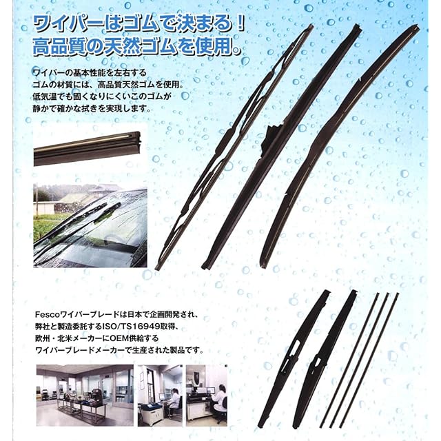 『Fesco フェスコ』ワイパーブレードは、<br>欧州、北米メーカーにOEM供給する、ISO16949を取得したOEM製造メーカーとのブランドライセンス契約により、<br>日本で企画開発された高品質ワイパーブレードメーカーです。<br><br> 【グラファイト+モリブデンのダブルコーティング!】<br> ビビリ、拭きムラ、筋状拭き残しの無い抜群の拭きで視界を確保!<br> 高品質の天然ゴムをベースとした、特殊配合成形ゴム(ノーマルラバー)に<br>グラファイト(炭素微粒子)二硫化モリブデン(MOS2)を二層コーティング!
