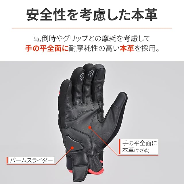 手の平に本革採用で、グリップとの摩耗に強くなり安全性を向上