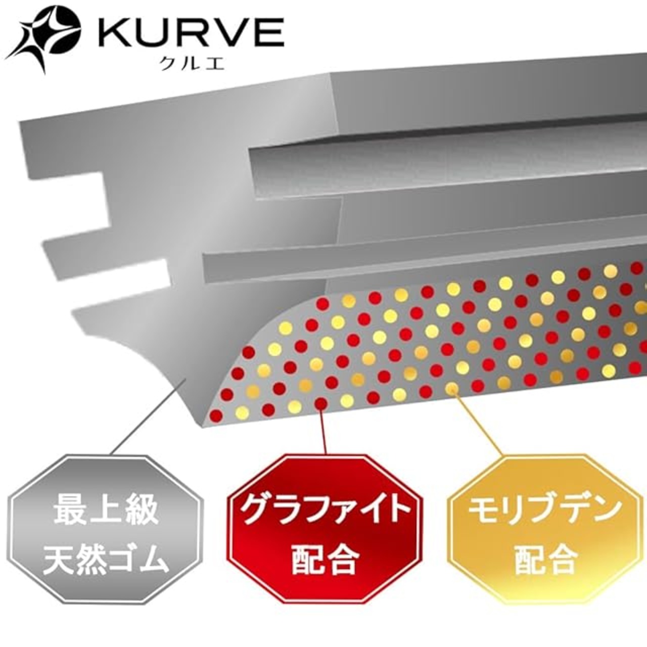 『KURVE クルエ』<br>KURVEの「5つのモットー」<br>より良いものを、見やすい・解りやすい・安い・買いやすい・使いやすいの商品づくりをモットーに<br>お客様に親しんで頂けるブランドを目指しているメーカーです。<br><br> 『KURVE クルエ』のワイパーブレード<br>世界各国にOEM供給する、製造メーカーとのブランドライセンス契約により、日本で企画開発された高品質ワイパーブレードです。<br><br> 【KURVE クルエ 雪用ワイパーブレードの特徴】<br> ●耐寒性実用試験(温度-40℃、湿度40%)でもゴム硬度を保ち、厳寒条件に対し抜群の払拭性能を発揮します。<br> ●リフィール(払拭ゴム)並びフレーム防護ゴム(フード)は、天然ゴムをベースに製品化<br> ●キャップ部完全気密処理による完全防水<br> ●フレームはステンレススチール鋼板に防錆塗装