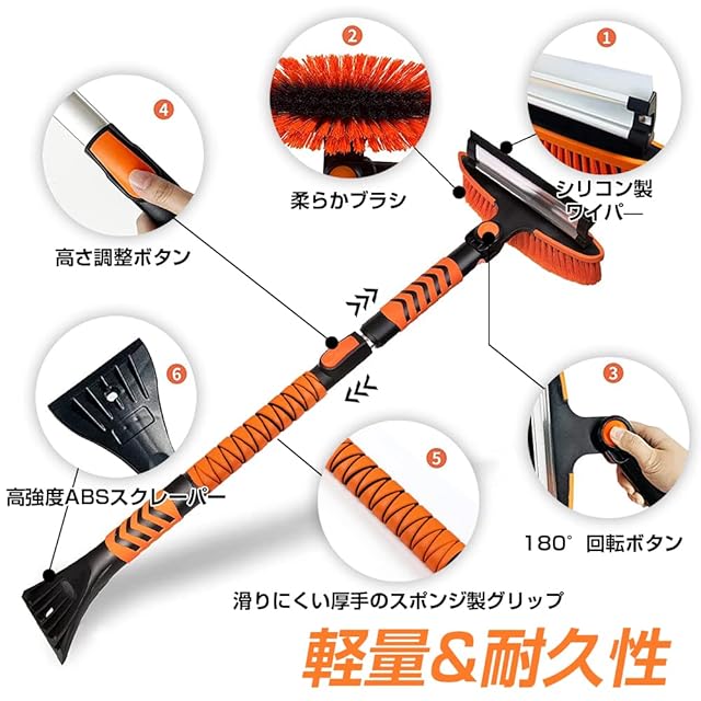 [ブラシ角度調整可] 高密度で太いブラシが雪を素早く除去し、時間と労力を節約します。ブラシのボタンを押すと、ブラシの角度を調整できる。ブラシのもう一方の端はシリコン素材で、ガラスを傷つけず、除污や排水に便利です。