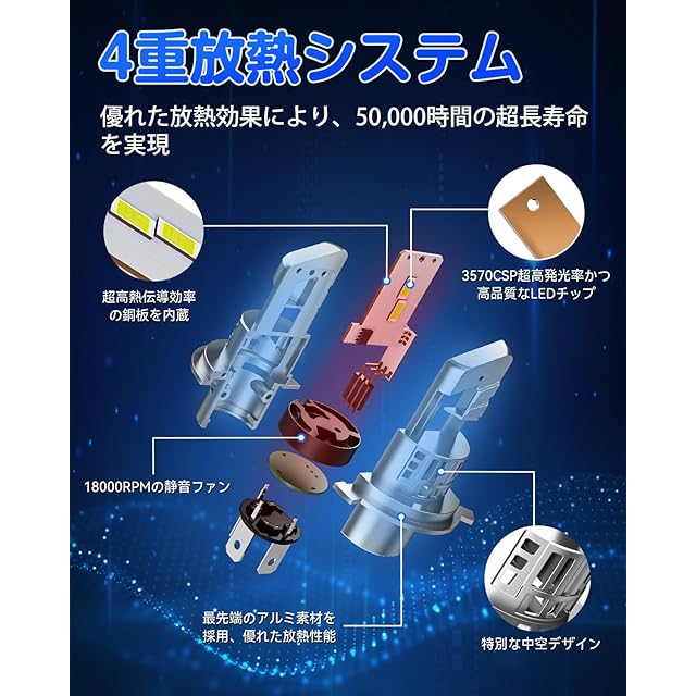 【3重放熱&IP68防水】ほかのh4 led ヘッドライトを取付ばっかりで、不点灯になりました、その現象はファンが不良の問題でLEDチップが高温を耐えません、ランプが不点灯になりました。本製品は高速冷却ファン付きで、LED基板の下が最高熱伝導効率の銅板を内蔵されています、航空用アルミニウムボディーに熱を伝導して、空気への放熱効率は従来品よりもっと速くてしています。さらに、IP68の防水防塵レベルで、極端な環境でも、安定発光できます。お客様の安全運転をお守りします。また、日本車専用キャンセラーを搭載、コンパクトサイズで、複雑な配線なし、取付便利の上で、99%の車種対応できます。ご注意:日本車専用キャンセラー、外車にはいけません。業界最新の線型キャンセラーを搭載で、日本のFM周波数帯域に影響がありません、ラジオにノイズを入りません。まだ、車コンピューターの異常エラーも出ません。