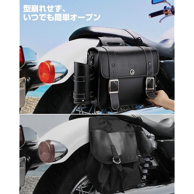 【幅広い車種対応】高品質PUレザー製の本サイドバッグは、ハーレー用(スポースター/ソフテイル/ダイナ/ロードキング)、ホンダ用(シャドウ/レブル)、カワサキ用(バルカン)など、多数の大型バイクモデルに適合します。ご利用の際は、マフラーとのクリアランス(間隔)を必ずご確認ください。