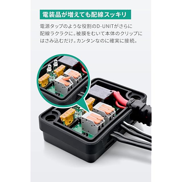 配線被覆を剥いてワンタッチ接続。圧着工具不要の簡単取り付け
