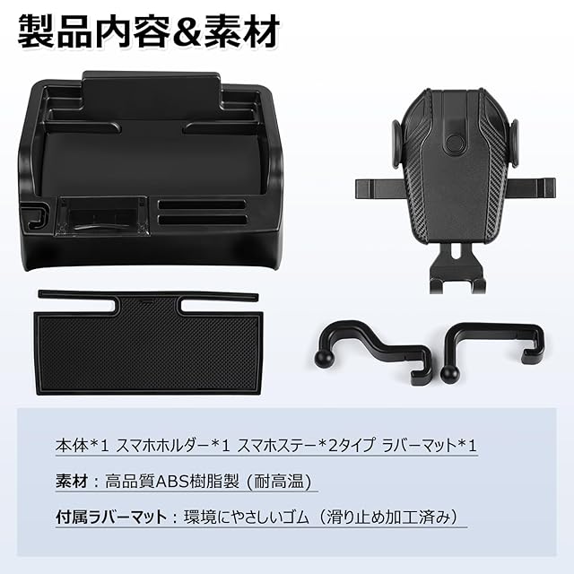 4.【セット内容&素材】:収納トレイ本体*1、スマホホルダー*1、スマホステー*2(2タイプ)、ロックリング*1、滑り止めマット*1。トレイ本体は無毒・無臭のABS樹脂を採用し、耐摩擦性と耐熱性に優れているため傷つきにくく、高温の環境でも変形しません。マットは柔らかいゴム製で、運転中の振動による転回やズレを防止し、カタカタ音を軽減します。また、水洗いだけで繰り返し使用可能のため、お手入れも楽々になります。