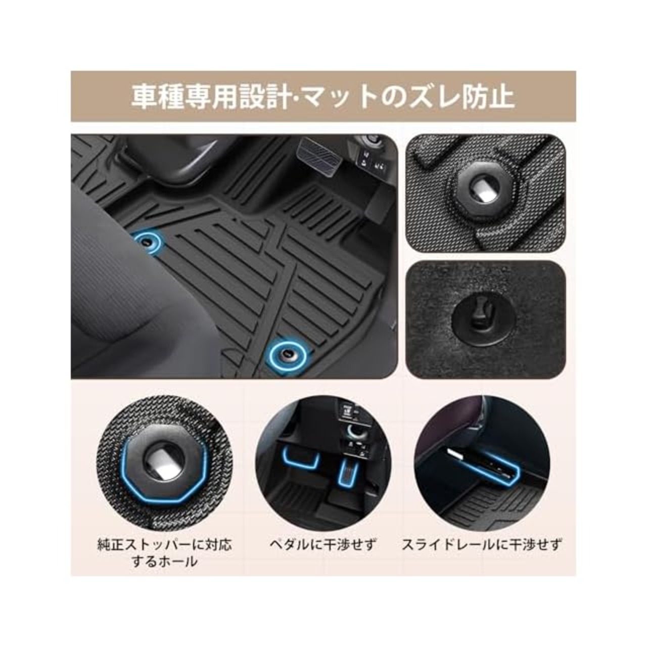 【車種専用設計】:運転の安全を配慮したKotesotoのN-BOX JF3 JF4専用3Dマットは純正のストッパーに対応するホールを採用し、マットズレや移動を防ぎます。車内の構造にぴったりフィットする車種専用設計により、ペダルや座席のスライドレールに干渉することなく、取り付け後も滑らず安定感を提供できます。安全性とフィット感を重視するお客様にとって最適なエヌボックJF3 JF4マットです。