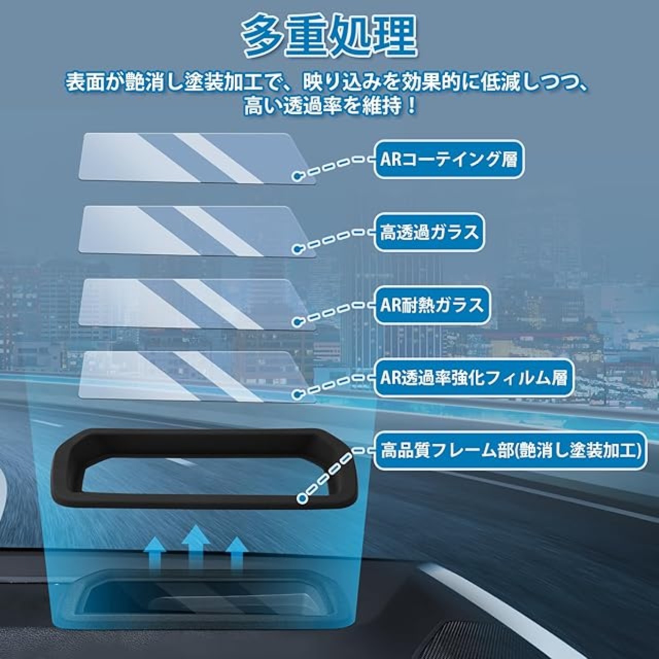 2.【二重像対策・高透過率】:本製品は特殊なARコーティング処理を施すことで光の屈折を最適化し、二重像を効果的に軽減。高い透過率を維持しながら、HUD表示を格段にクリアに映し出すことを実現しました。